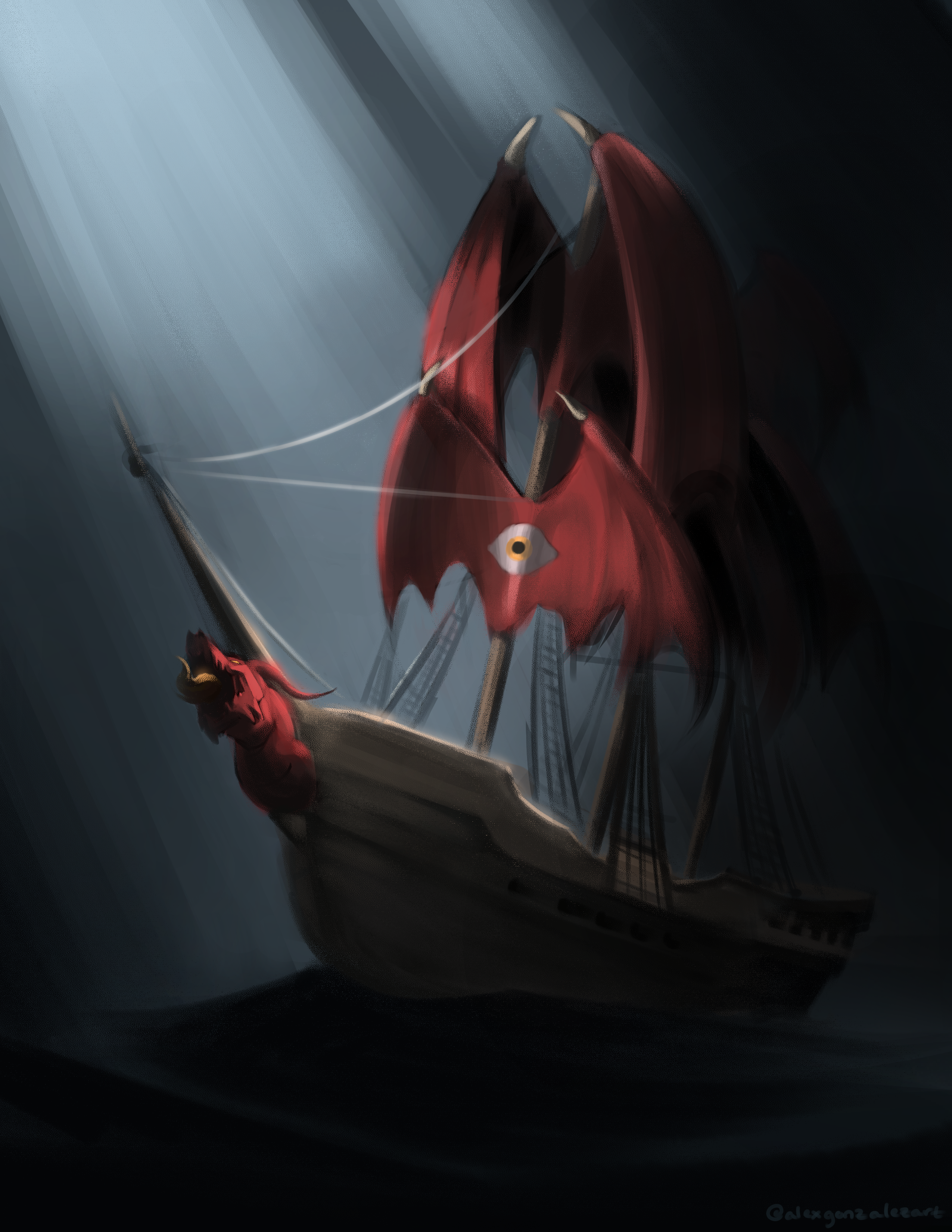 Commission. A ship with red dragon wings for sails and a dragon bust as a figurehead.