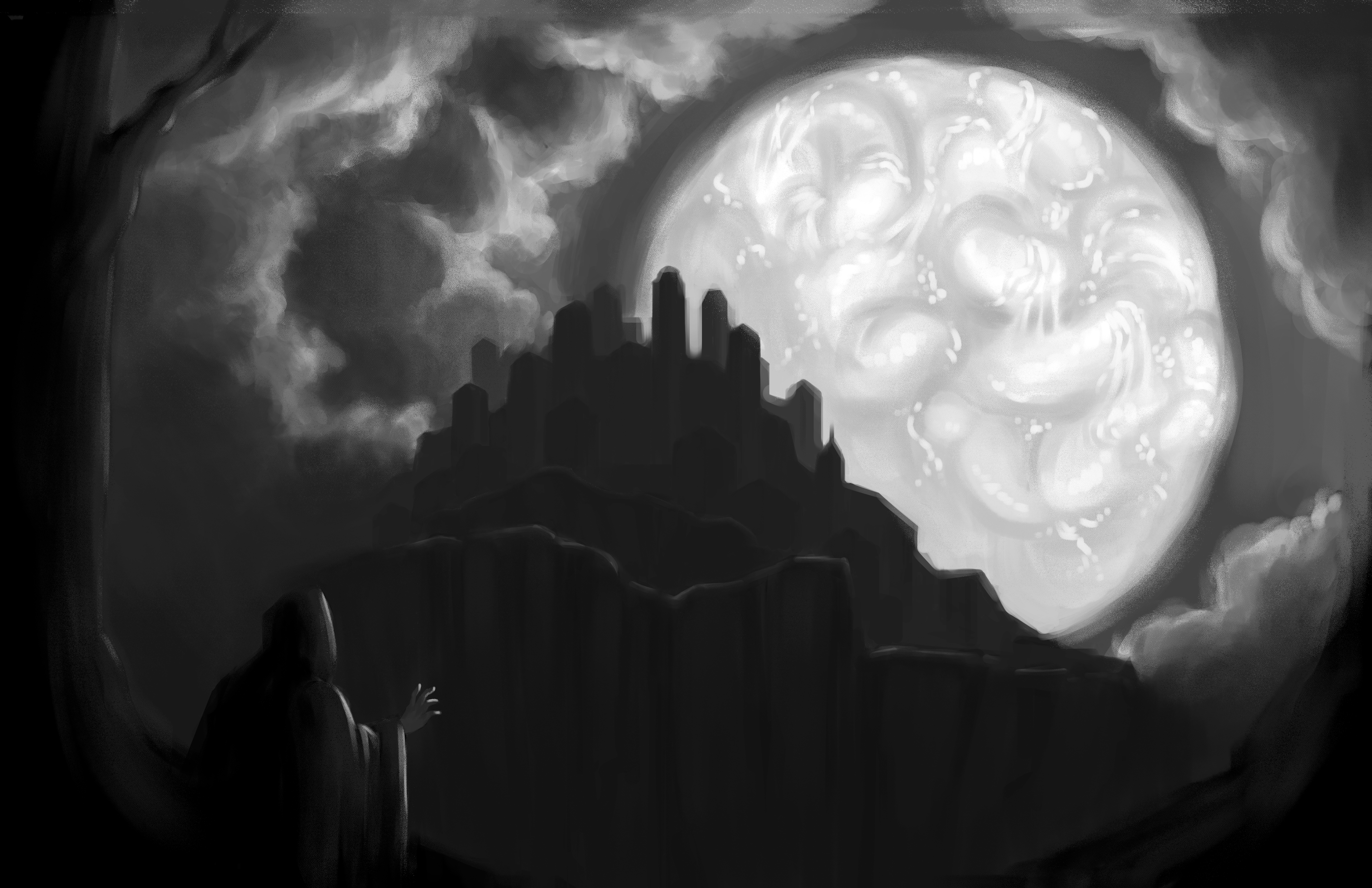 Digital painting class assignment for a BFA thesis project. The thesis project was a board game, and wanted illustrations for their cards. “Surface of the Idle Swallower” was one of the ritual cards, and depicts a phenomenon where the moon would change texture to resemble that of intestines.